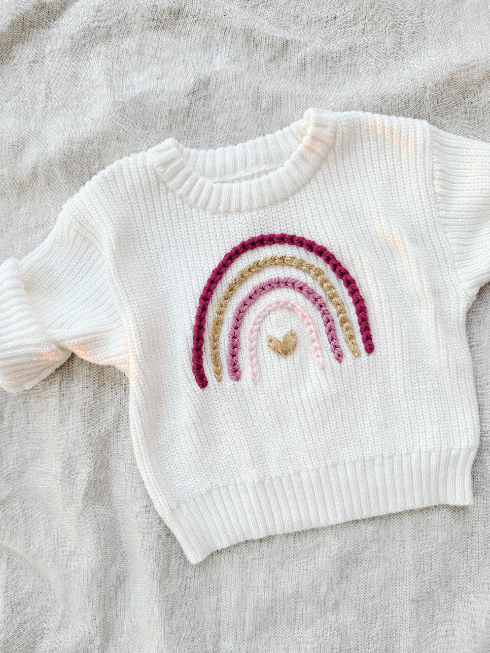 A soft and classic rainbow with one arch stitched in gold — a symbol of joy, love, and hope. This timeless design can be customized in your favorite colors, making it a meaningful piece to gift or keep.